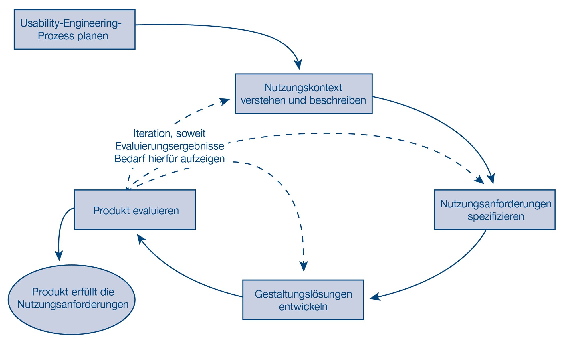 Usability ist definiert als »Ausmaß, in dem ein interaktives System durch bestimmte Benutzer in einem bestimmten Nutzungskontext genutzt werden kann, um festgelegte Ziele effektiv, effizient und zufriedenstellend zu erreichen« (ISO 9241-11). Hohe Usability lässt sich planen und erzielen, wenn in allen Phasen der Entwicklung des interaktiven Systems der Benutzer im Mittelpunkt steht. Man spricht dabei von einem benutzerzentrierten Gestaltungsprozess, der aus vier miteinander verbundenen Aktivitäten besteht (siehe Abbildung 1).